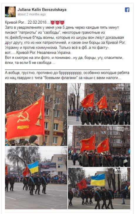 22 февраля в Кривом Роге на мероприятиях по случаю 74-летия освобождения города от фашистской оккупации были использованы красные флаги. По словам организаторов, это были оригиналы боевых знамен - экспонаты из местного музея, которые не подпадают под действие законов «о декоммунизации». Однако в соцсетях пользователи выразили возмущение.