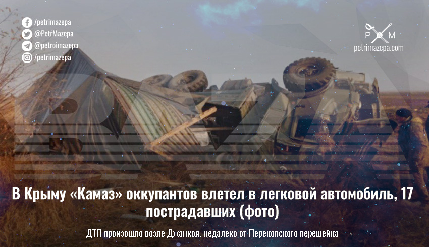 Авария произошла неподалеку от села Орденоносное, под Джанкоем, недалеко от Перекопского перешейка. «Камаз» оккупантов влетел в лоб в автомобиль Mitsubishi Lancer, после чего грузовик с пометкой V вылетел с дороги и перевернулся. На фото можно увидеть значительные повреждения «Камаза».