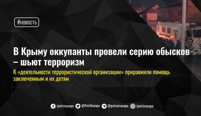 С четырех часов утра в Крыму оккупанты проводили новые массовые обыски в Белогорске, Бахчисарае, Симферополе, Севастополе и Советском районе Крыма по, как минимум, семи адресам. Задержанным вменяют статью 205.5 УК РФ – организация деятельности террористической организации. Хотя настоящая причина – они приносили передачи заключенным крымским татарам и вели проект поддержки детей заключенных.