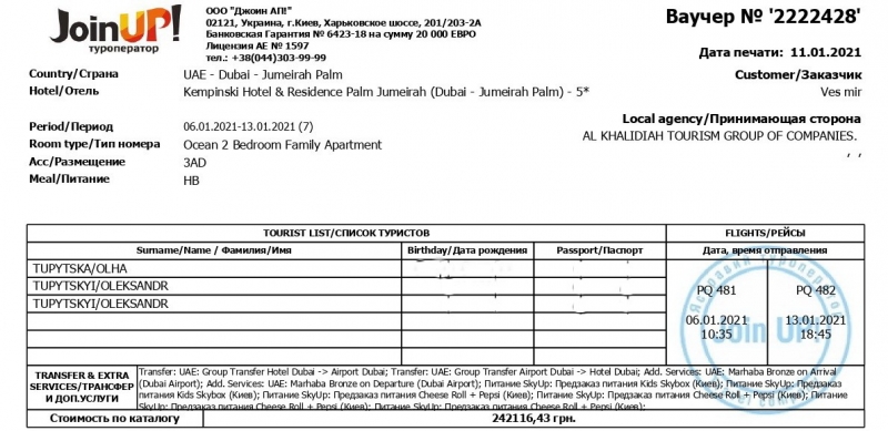 «Стоимость пакета услуг, предоставляемого туроператором на трех человек, составляет 242116,43 грн. В стоимость тура входит авиаперелет в обе стороны, проживание в двухкомнатном номере отеля, двухразовое питание, трансфер, страхование и стоимость туристического обслуживания», - значится в заявлении.