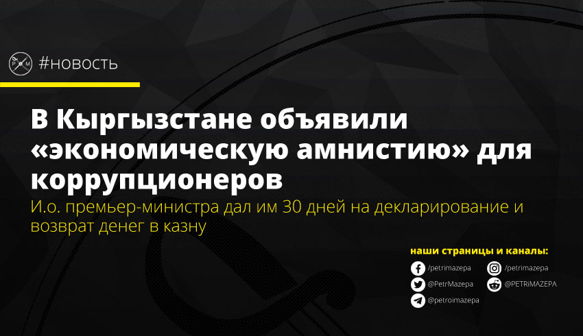 В Кыргызстане и. о. премьер-министра и главы государства Садыр Жапаров заявил о «экономической амнистии» - он требует чтобы в течение 30 дней «коррупционеры» и чиновники, таможенники и финансисты задекларировали свое имущество в полном объеме, и возместили все незаконно полученные средства. В противном случае Жапаров обещает самые жесткие меры.