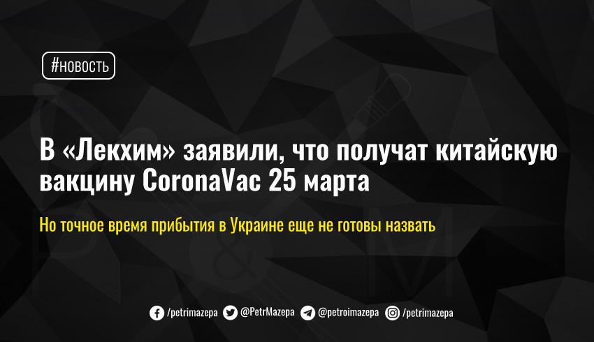 Украинская компания-поставщик «Лекхим» заявила, что планирует получить первую партию вакцины CoronaVac 25 марта.