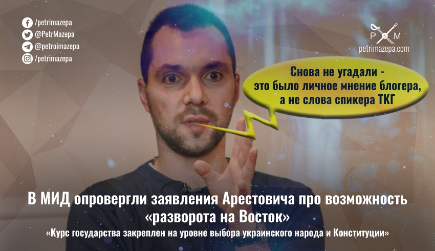 В Министерстве иностранных дел Украины прокомментировали слова Алексея Арестовича (спикера украинской делегации в ТКГ и внештатного советника главы ОПУ Андрея Ермака) про возможный разворот Украины «на Восток», если европейские страны и США решат обменять стратегические интересы Украины на возобновление отношений с РФ. По мнению Арестовича – в таком случае Украина совершит разворот на Восток и будет сотрудничать с Китаем, Турцией и другими азиатскими странами.