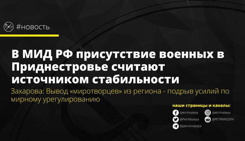 Официальный представитель Министерства иностранных дел России Мария Захарова заявила, что намерение избранного президента Молдовы Майи Санду добиваться вывода российских войск из Приднестровья направлено на подрыв усилий по мирному урегулированию ситуации в регионе. В МИД страны-агрессора считают, что присутствие российских военных в Приднестровье обеспечивает стабильность в регионе.