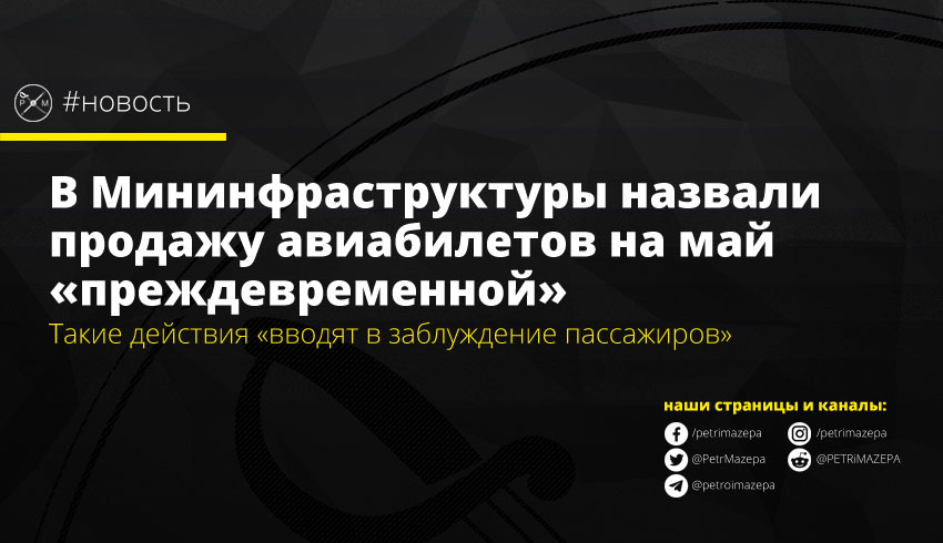 «Министерство подготовило изменения в соответствующие постановления правительства, которые должны быть одобрены для восстановления всех видов сообщений, не только авиа. Относительно действий авиакоманий по продаже билетов на 23 мая — такие действия до принятия решений правительством являются преждевременными и вводят в заблуждение пассажиров», - цитирует заявление Мининфраструктуры «НВ Бизнес».