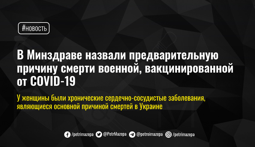 Женщина скончалась 23 марта в поселке Черноморское Одесской области. Военную вакцинировали 21 марта. Противопоказаний к прививке (а именно аллергических реакций на компоненты вакцины) у нее не было – как и жалоб на здоровье в день вакцинации.