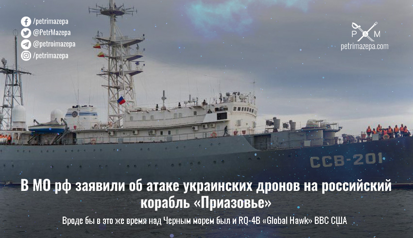 Шесть ударных надводных дронов атаковали средний разведывательный корабль «Приазовье» ССВ-201 Черноморского флота рф. Согласно официальному сообщению минобороны рф, корабль выполнял задачу «контроля за обстановкой и обеспечением безопасности по маршрутам пролегания газопроводов "Турецкий поток" и "Голубой поток"».