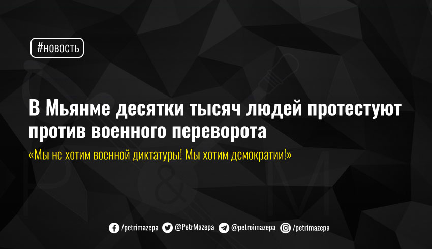 В Мьянме десятки тысяч людей вышли на улицы в рамках протеста против военного переворота и диктатуры - они требуют освободить президента страны и возвращения демократии. Это самые массовые протесты в Мьянме с момента «Шафрановой революции» в 2007 году, спровоцировавшей демократические реформы и смену правительства.