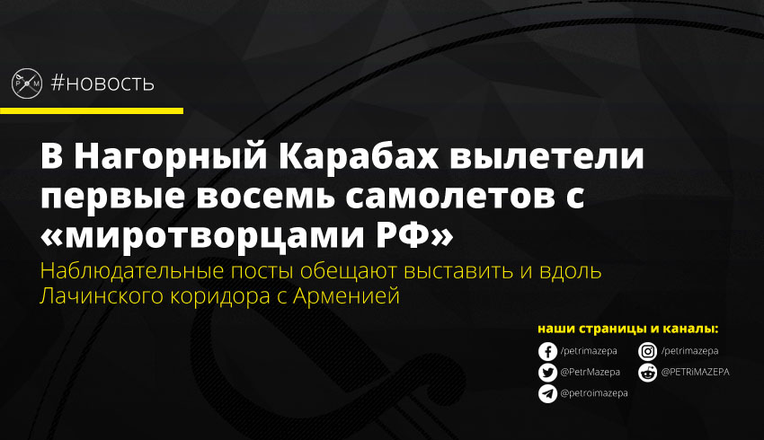 В Нагорный Карабах вылетели первые восемь самолетов с «миротворческим контингентом» страны-агрессора. Они обещают выставить блокпосты на линии соприкосновения и вдоль соединяющего Нагорный Карабах с Арменией Лачинского коридора. Первые российские военные были замечены в зоне конфликта еще ночью.