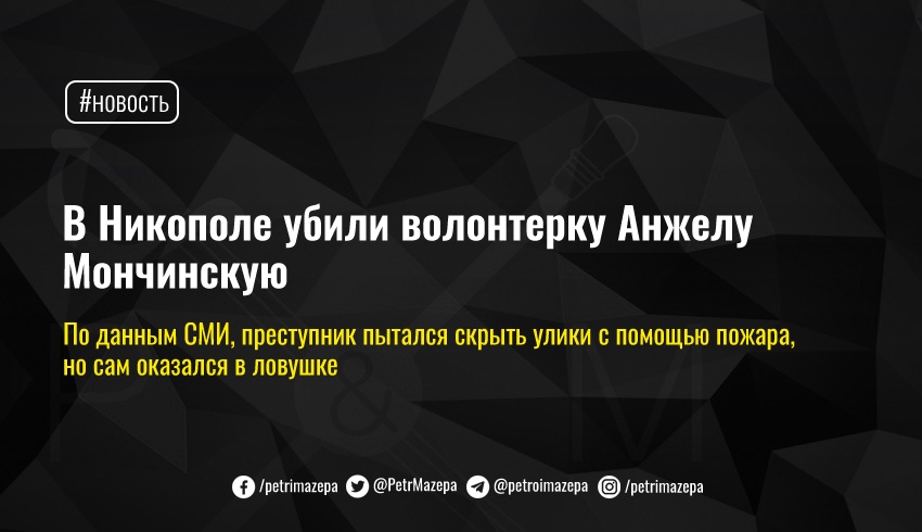 В понедельник, 12 апреля, в Никополе Днепропетровской области напали на волонтерку Анжелу Мончинскую. Женщину доставили в больницу, но там он скончалась от полученных при нападении травм. По данным местных СМИ, преступник пытался скрыть улики с помощью поджога, но не смог покинуть помещение и был задержан.