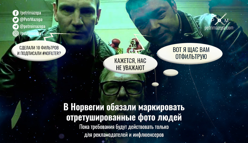 В Норвегии парламент (стортинг) принял закон, который обязывает маркировать фото людей, если на нем были отретушированы какие-либо части тела. Этот закон предусматривает правки в закон о маркетинге и распространяется на фото, которые публикуют рекламодатели и инфлюенсеры.