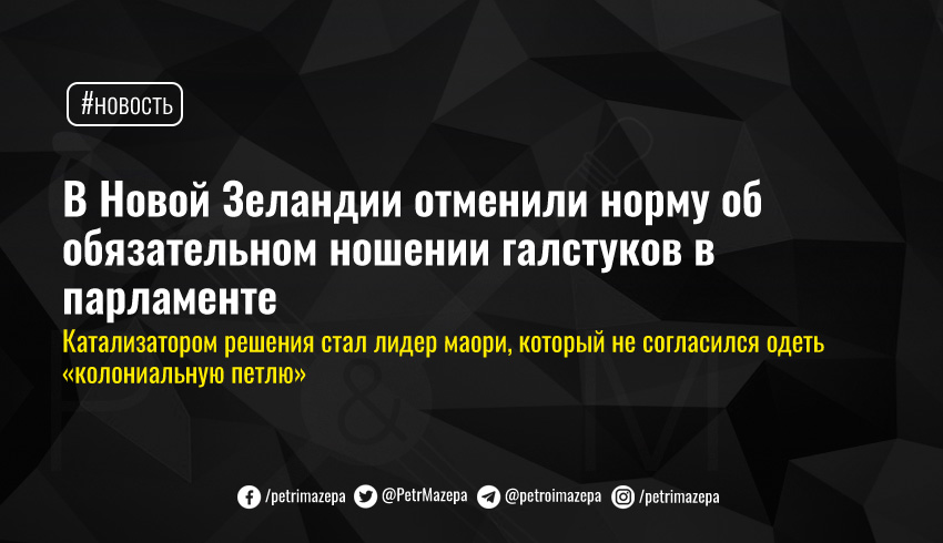 В Новой Зеландии теперь не обязательно носить галстуки на заседаниях парламента. Эту норму отменили на фоне скандала, который вспыхнул после того, как депутата Равири Вайтити, лидера партии коренного народа Новой Зеландии маори, выгнали из зала заседания парламента в связи с тем, что он отказался надеть галстук. Тогда он назвал галстук «колониальной петлей».