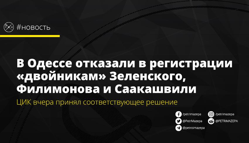 Центральная избирательная комиссия, после жалобы одесской областной организации партии «Слуга народа», отменила постановления Одесской городской территориальной избирательной комиссии о регистрации кандидатами на пост мэра Одессы тезок Владимира Зеленского, Олега Филимонова и Михеила Саакашвили.