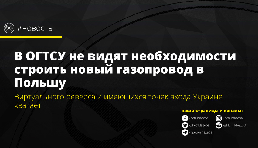 Генеральный директор компании «Оператор ГТС Украины» (ОГТСУ) Сергей Макогон сообщил, что оператор не видит необходимости в строительстве нового газопровода между Украиной и Польшей. По его мнению, все потребности Украины в импорте газа можно удовлетворить с использованием уже существующей инфраструктуры и виртуального реверса (пока есть что реверсировать - прим.ред).