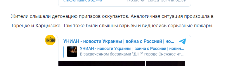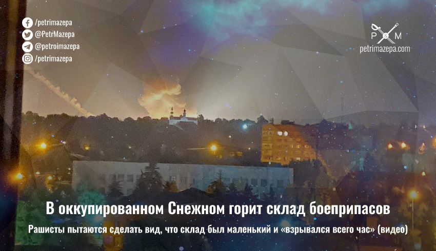 Ночью был нанесен удар по городу Снежное, который контролируют пророссийские марионетки из «ДНР». Местные жители сообщают о «прилете» по складу с боеприпасами и заводу «Химмаш». Также известно, что ночью были аналогичные прилеты по оккупированным Харцызску и Торецку.