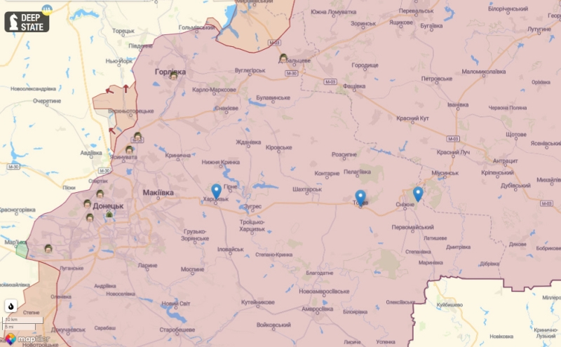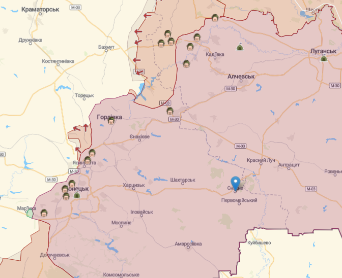 Снежное находится довольно глубоко в тылу (расстояние от линии фронта более 70 км).