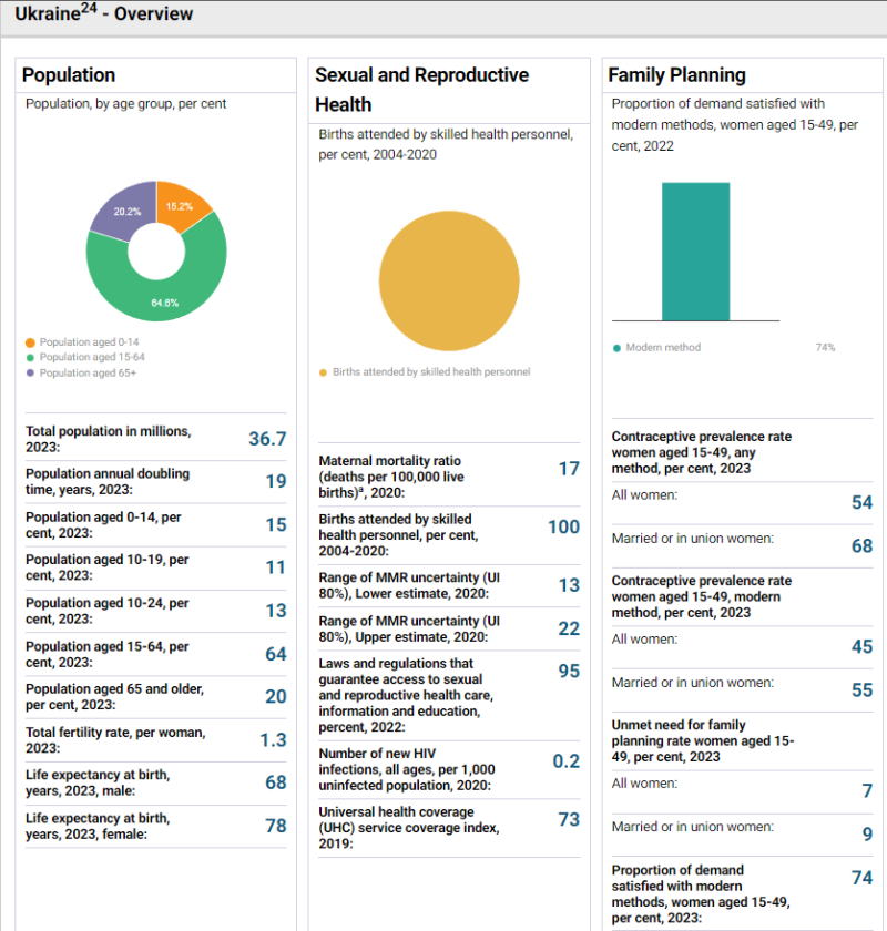 Согласно отчету Фонда населения ООН, в Украине на 2023 год проживает 36,7 миллиона человек.