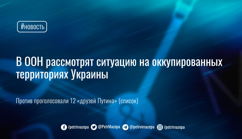 В ООН рассмотрят ситуацию на оккупированных территориях Украины – в отдельных районах Донецкой и Луганской областей, а также в Крыму. Такое решение поддержал Генеральная ассамблея ООН большинством голосов, против выступили только РФ и 12 союзников Путина.