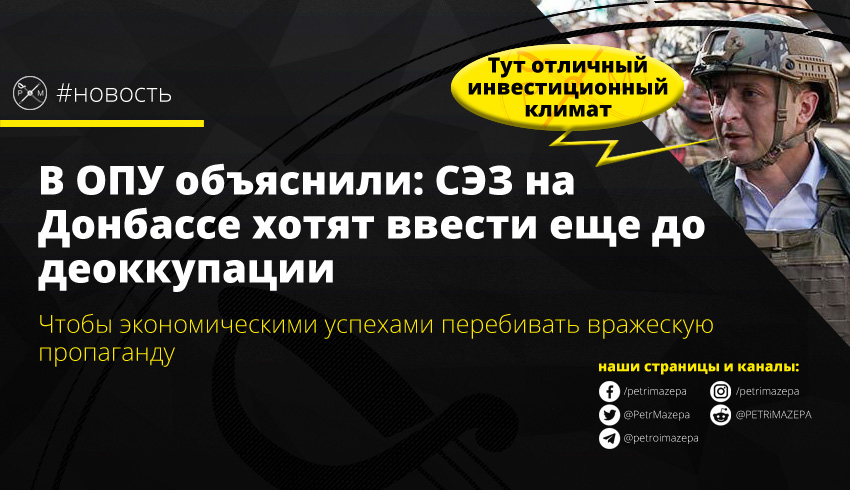 В Офисе президент Украины (ОПУ) поняли, что объяснения по вопросам Зеленского нужно давать побыстрее. И снова попытались развеять негативные интерпретации вопроса. По словам ОПУ, свободную экономическую зону (СЭЗ) на Донбассе необходимо создать как можно скорее. И тогда, в регион должен бы потечь поток инвестиций от международных партнеров. А поскольку все будет прозрачно и без коррупции – инвестиции превратятся в улучшение социально-экономической ситуации на освобожденной части Донбасса. И она станет витриной, способной противостоять вражеской пропаганде из РФ.