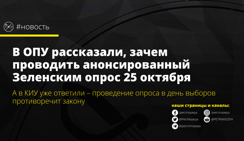 В Офисе президента Украины (ОПУ) рассказали об официальных причинах, которые стоят за проведением опроса 25 октября. Снова не обошлось без «папиредников». О том, насколько законна такая инициатива Владимира Зеленского в ОПУ умолчали. Пришлось указывать на нарушение Комитету избирателей Украины (КИУ).