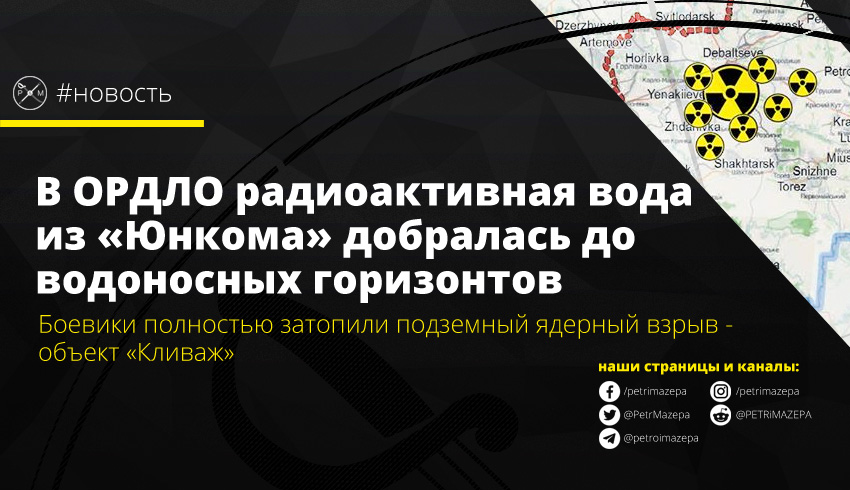 - Боевики и россияне приняли решение затопить шахту «Юнком» вместе с законсервированным хранилищем радиоактивных отходов после подземного ядерного взрыва (объект «Кливаж») в апреле 2018 года. Уже 25 апреля ГПУ открыла по этому факту дело по статье «Экоцид».