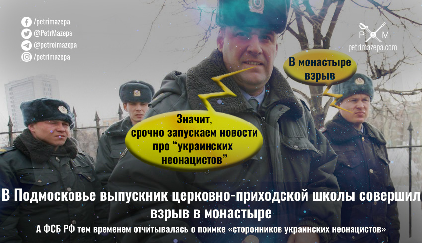 В России в подмосковном Серпухове подросток взорвал бомбу на территории монастыря. Он учился в церковно-приходской школе и жаловался на буллинг. Но к чему разбираться в причинах реального теракта, если можно снова отчитаться о поимке «сторонников украинских неонацистов», видимо подумали в ФСБ РФ, и выпустили очередную новость про «М.К.У.».