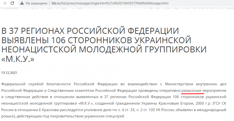 Но вместо тщательного расследования российские силовики отчитались о том, что «проведены оперативно-разыскные (и куда смотрят защитники русского языка – прим. ред.) мероприятия» в отношении 106 сторонников «украинской неонацистской молодежной группировки "М.К.У."». Якобы молодые люди собирались совершать вооруженные нападения на образовательные учреждения.