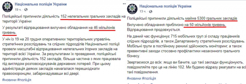 В пятничное утро полиция с профильным министром во главе ворвалась с громкими цифрами – за ночь была прекращена деятельность 152 незаконных игральных заведений и изъято оборудования на 46 млн грн. Последние отчеты полиции и примкнувшего к ним Гончарука показывают, что количество закрытых заведений выросло до 5300, а вот сумма изъятого оборудования – только до 50 млн грн.