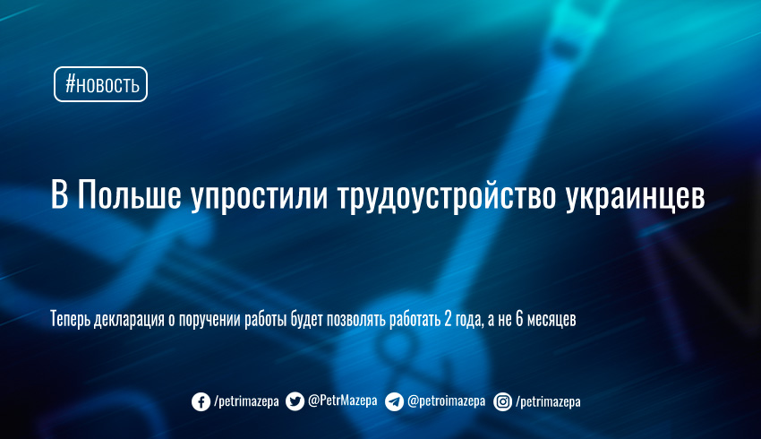 Согласно опубликованным 4 января пресс-службой президента Польши изменениям, граждане этих шести стран смогут работать в Польше не шесть месяцев, как это было раньше, а два года без разрешения на работу, а на основании декларации о поручении работы, сообщает «Новинарня».