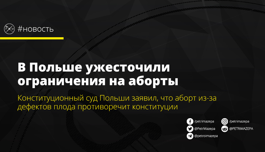 Конституционный суд Польши заявил, что аборт из-за дефектов плода противоречит конституции, что равносильно почти полному запрету на прерывание беременности в стране.