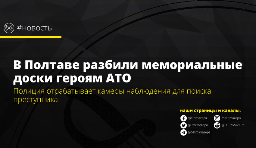 Ночью в Полтаве вандалы разбили мемориальные доски погибшим героям – две доски, не антивандальные, серьезно пострадали, а третью разбить не удалось потому что она была антивандальной, там пострадала только подставка для цветов.