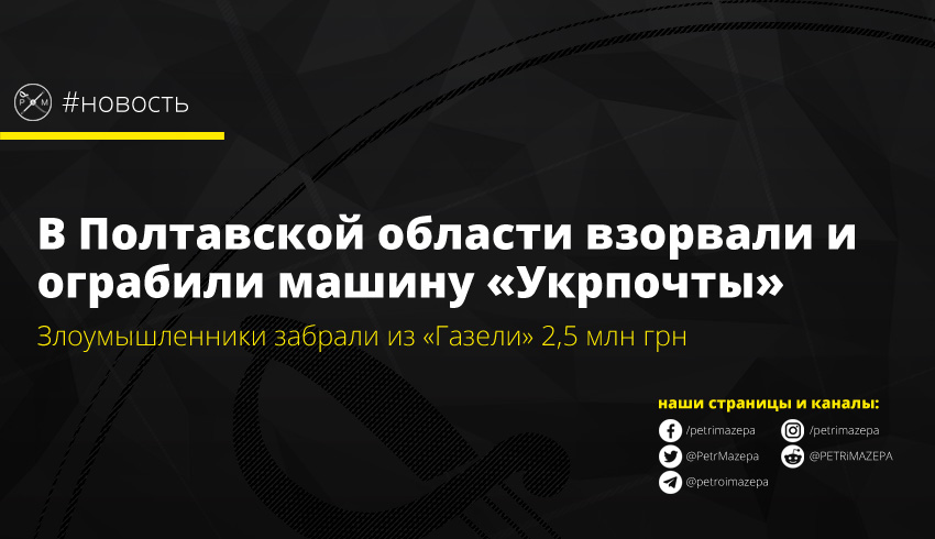Близ села Тишки Лубенского района Полтавской области неизвестные подорвали автомобиль «Газель», который принадлежит «Укрпочте». Злоумышленники украли 2,5 млн грн и пистолет охранника. Есть пострадавшие.