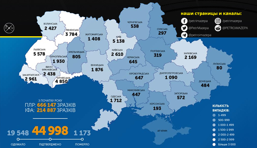 В Украине всего было подтверждено 44998 случаев COVID-19, из них 19 548 выздоровели (+433 за последние сутки), 1173 умерли (+14). За последние сутки лабораторно подтверждено 664 случая. Количество активных больных по состоянию на 01 июля - 24277 человек.