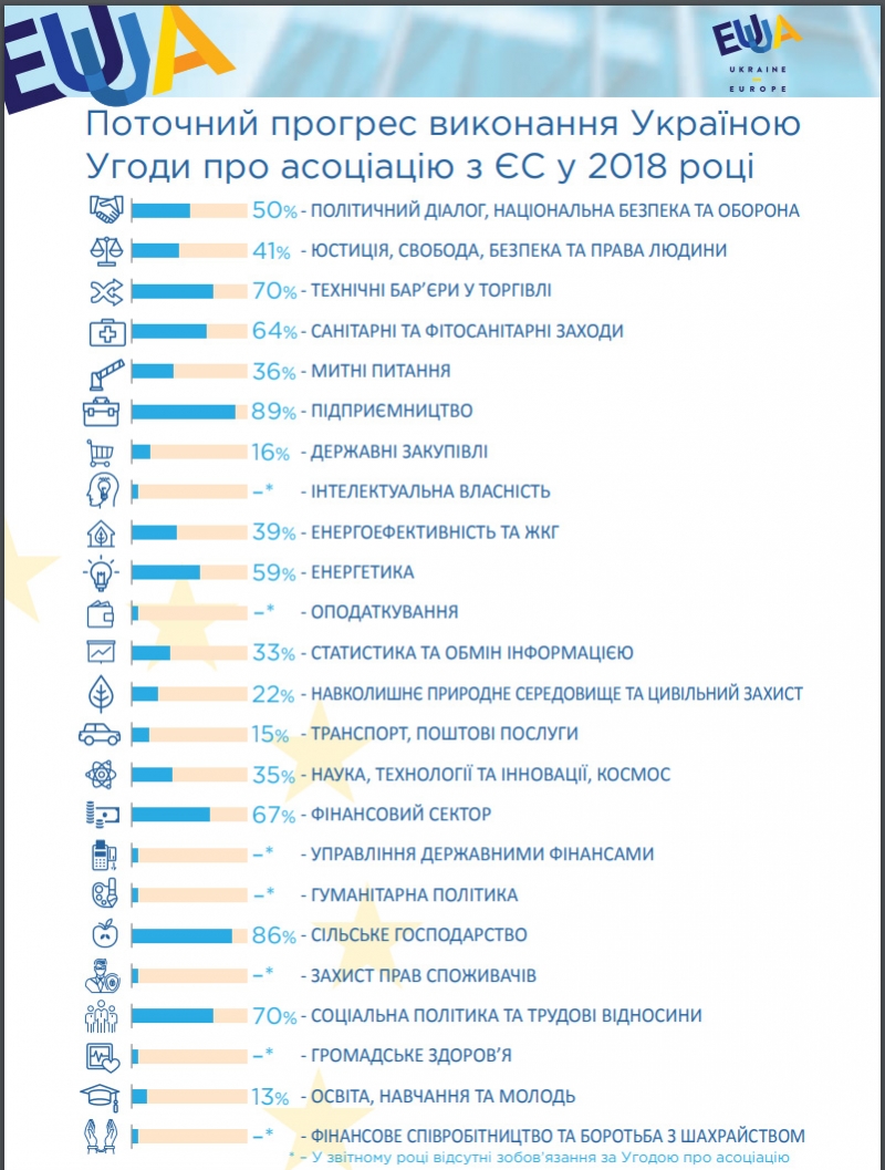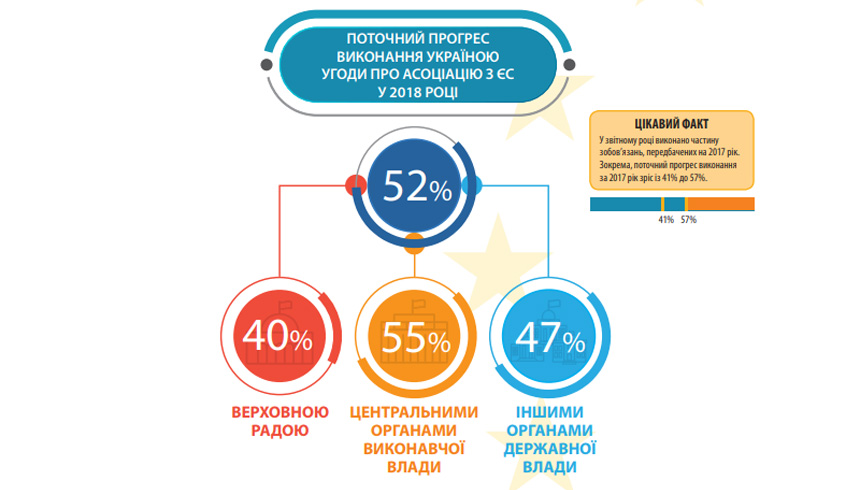 Также в отчете приводится показатель общего прогресса выполнения всех обязательств, который показывает динамику выполнения Соглашения в течение срока ее действия, начиная с временного применения отдельных положений в 2014 году. В 2017 году этот показатель составлял 42%, а в 2018 году вырос до 52%. С 28 до 40% выросло количество выполнения обязательств по соглашению Верховной радой, с 43 до 55% - центральными органами исполнительной власти и 34 до 47% - другими органами государственной власти.