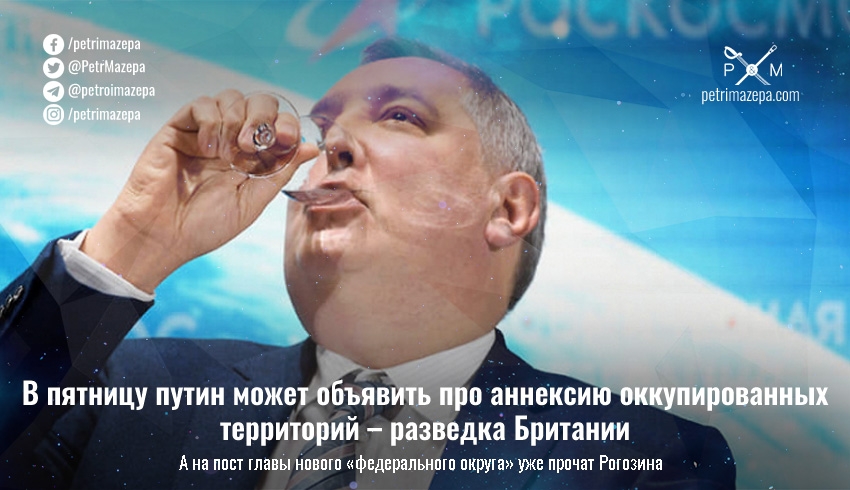 По данным разведки Великобритании, в пятницу, 30 сентября, во время выступления перед обеими палатами российского парламента кремлевский карлик владимир путин может объявить об аннексии оккупированных территорий материковой части Украины. По данным российских СМИ на роль главы этого нового «федерального округа», скорее всего, назначат Дмитрия Рогозина.