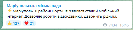 В Мариупольском горсовете сообщили что в районе Порт-Сити в осажденном Мариуполе появился интернет, который позволяет совершать видео-звонки.
