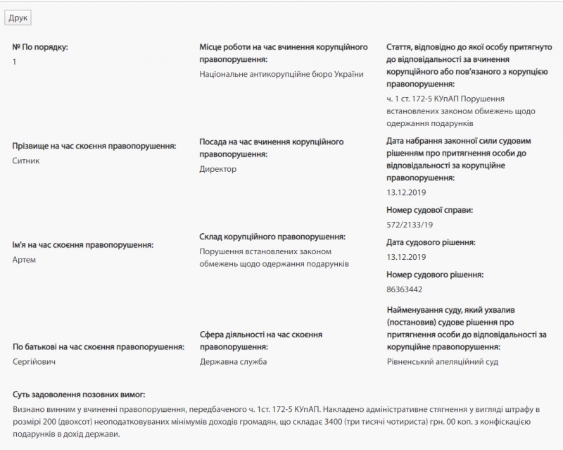 Постановление апелляционного суда жалобу защиты была отклонена, а сам Сытник признан виновным в совершении административного правонарушения по ч. 1 ст. 172-5 КУоАП (Нарушение установленных законом ограничений относительно получения подарков). Теперь информация об этом решении внесена в Единый государственный реестр лиц, которые совершили коррупционные правонарушения или связаны с такими правонарушениями.