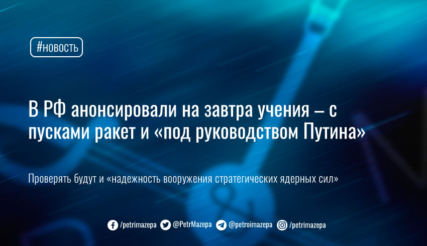 В РФ анонсировали проведение завтра учений под руководством президента Владимира Путина – под его присмотром планируется запускать ракеты, проверять готовность ядерных сил и двух флотов.