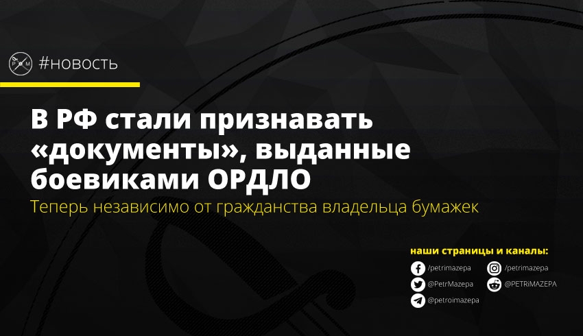 Президент страны-агрессора Путин внес изменения в свой указ от 2017 года о признании на территории РФ «документов», выданных боевиками ОРДЛО. Ранее такие «документы» признавались только для граждан Украины и лиц без гражданства, постоянно проживающих на оккупированных территориях. Теперь же в РФ их будут признавать без учета гражданства владельца.