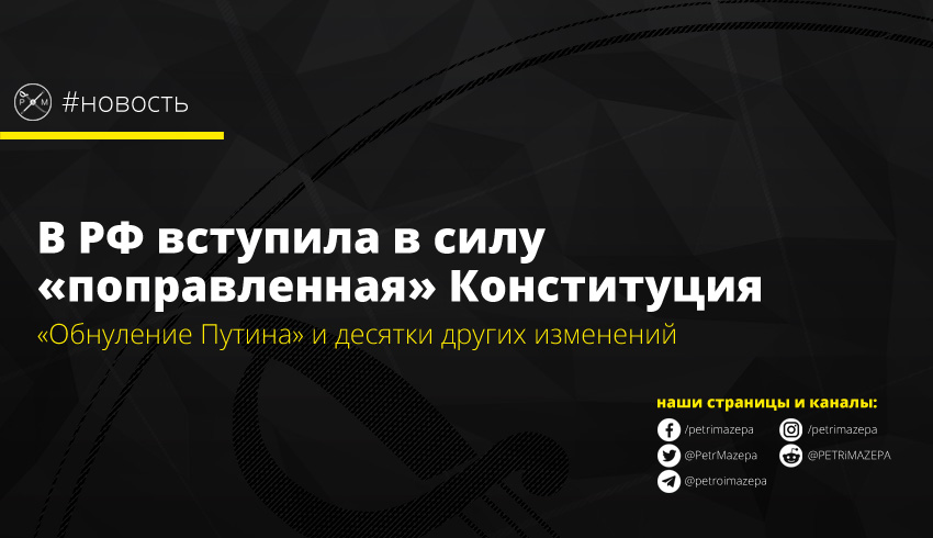 В России вступила в силу обновленная Конституция с поправками, одобренными на общероссийском голосовании. Соответствующий указ накануне подписал президент РФ Владимир Путин. Обновленный текст Конституции России опубликован на официальном портале правовой информации страны-агрессора.