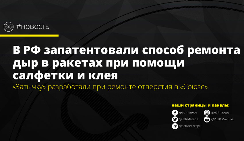 Производитель российских космических кораблей «Союз» компания «Энергия» оформила патент на способ ремонта дыр в обшивке космических кораблей. Им предполагается создание «затычки» в дыре с использованием тканевых салфеток, пропитанных и дополнительно зафиксированных герметиком.