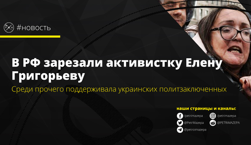 В России найдено тело общественной активистки Елены Григорьевой. На нем обнаружено восемь смертоносных ножевых ранений. Женщина отстаивала права ЛГБТ, а также сестер Хачатурян, которых подозревают в убийстве отца-насильника. Проводила пикеты Григорьева и в поддержку крымских татар и украинских политзаключенных.