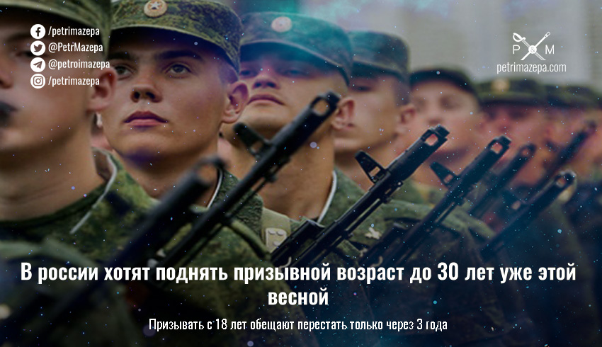 В россии решили повысить призывной возраст — призывать на срочную службу в армию граждан в возрасте до 30 лет собираются уже этой весной. Повышение призывного возраста в россии займет от 1 до 3 лет, сам процесс будет происходить поэтапно, но начнут уже этой весной. По сути, власти задвигают россиянам, что призывной возраст сдвигают с 18-27 лет на 21-30. Но по факту из-за «поэтапного введения» имеем ситуацию, когда призывной возраст в рф расширяют с 18 до 30 лет на время, когда Кремлю надо больше солдат.