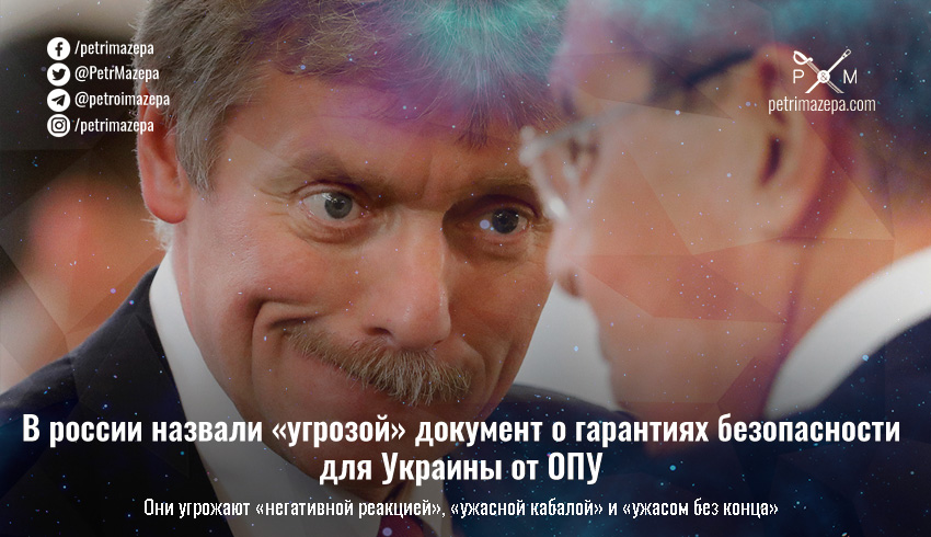 Вчера в Офисе президента представили рекомендации по гарантиям безопасности для Украины — сегодня россияне таки смогли документ прочитать и отреагировали в типичном стиле российской пропаганды. Песков пригрозил «негативной реакцией», назвал документ «угрозой» и повторил требования «ликвидировать угрозу для россии» со стороны Украины. А представитель МИД рф Захарова и вовсе назвала документ «ужасной кабалой» для Европы.
