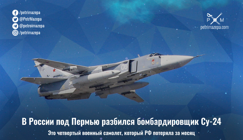 Под Пермью разбился бомбардировщик Су-24, но пилоты успели катапультироваться. Их нашли и госпитализировали. Как заявили российские военные – самолет потерпел крушение «при перелете на ремонт».
