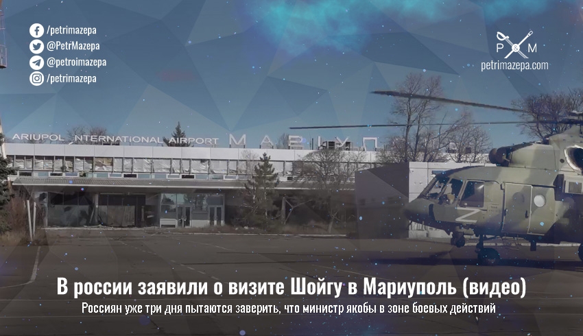 Видео, обнародованное Министерством обороны россии, можно увидеть в Twitter. На нем можно увидеть вертолет, который останавливается в разрушенном аэропорту Мариуполя, а затем Шойгу на фоне разрушенного торгового центра. Скорее всего, это ТРЦ Амстор на окраине Мариуполя и всего в 5 км от аэропорта. Сообщается и о том, что Шойгу доложили о строительстве водовода из Ростовской области в оккупированную Донетчину — то есть россияне уже даже не рассчитывают использовать канал Северский Донец — Донбасс по назначению.