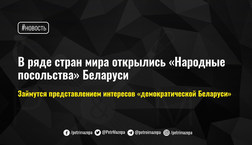 Представители белорусской диаспоры за рубежом открыли «Народные посольства» Беларуси в ряде стран мира. Церемония состоялась в онлайн-режиме при участии лидеров белорусской оппозиции и депутатов Европарламента. Проект поддержали белорусские общины, которые считают, что нынешняя власть утратила легитимность не только в Беларуси, но и за ее пределами.