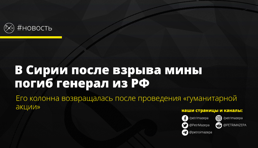 В Сирии от взрыва мины около нефтяного поля Ат-Тайм погиб российский генерал Вячеслав Гладких. Вместе с ним погибли еще глава национальной обороны города Аль-Меядин Мухаммад Тайсар Аз-Захир с четырьмя подчиненными, еще трое ранено. Колонна генерала возвращалась после проведения «гуманитарной акции».