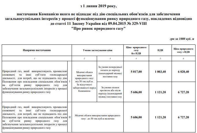 НАК «Нафтогаз України» опубликовала ценовые предложения на природный газ, которые будут действовать с 1 июля 2019 года, для промышленных потребителей и других хозяйствующих субъектов. Минимальная цена вплотную приблизилась к 5 000 грн за тысячу кубов газа без НДС.