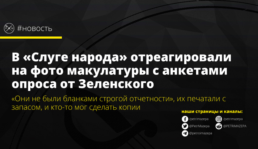 На страницах партии «Слуга народа» опубликовали комментарий про «якобы уничтоженные анкеты по опросу "5 вопросов от Президента"». В заявлении приводится сразу несколько причин, почему могли появиться фотографии с упакованной макулатурой из опросных листов.
